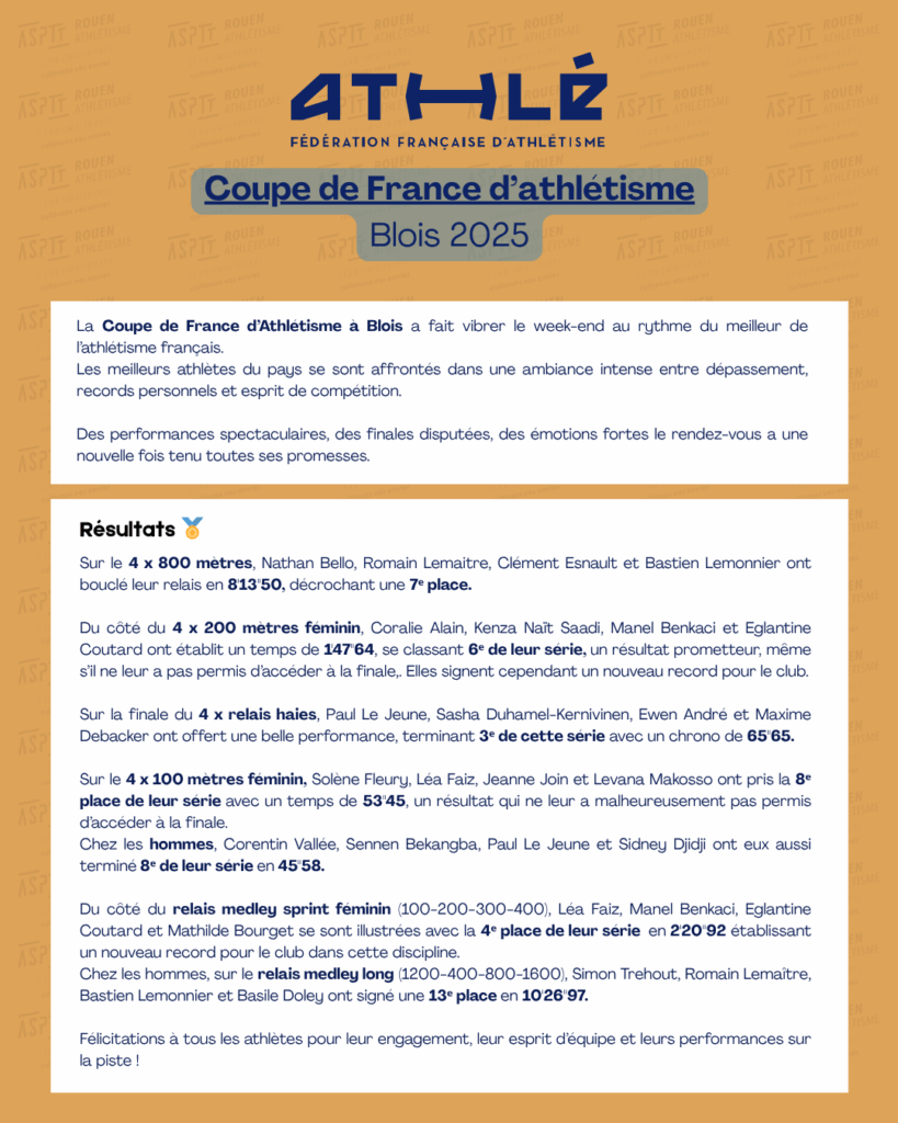Nos résultats lors de la Coupe de France à Blois Publié le 15 octobre 2025Auteur/autrice aspttrouenathle 0