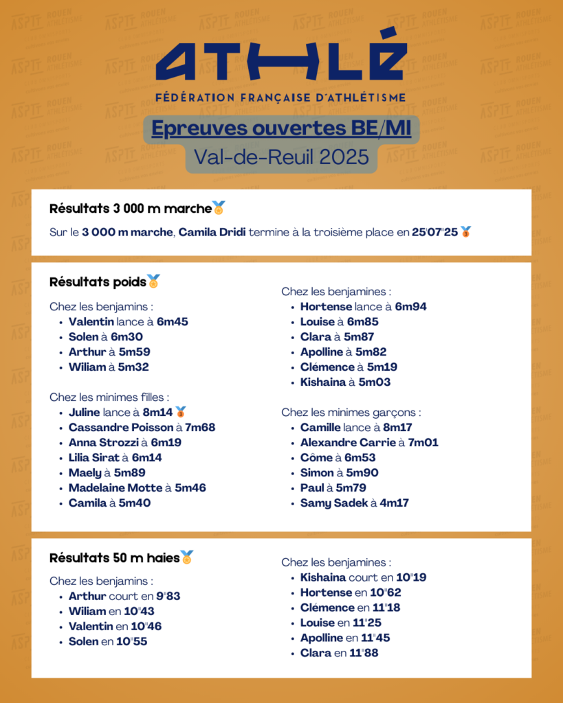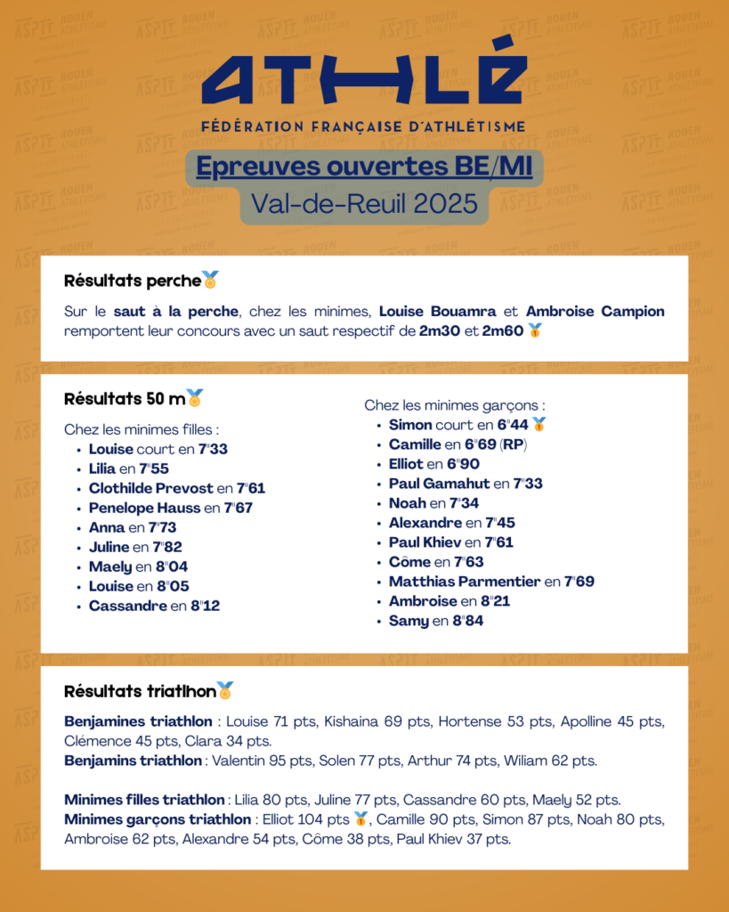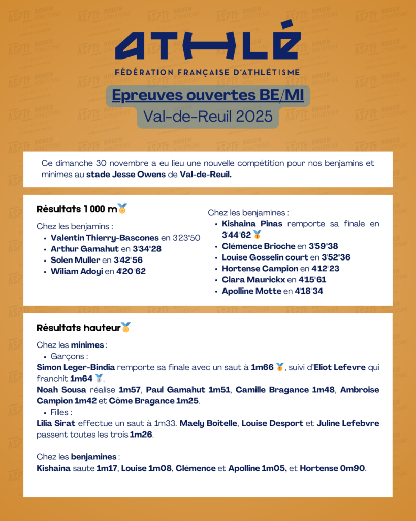 Départementaux d’épreuves combinées BE et épreuves ouvertes MI à Val de Reuil le 30 novembre 2025 Publié le 4 décembre 2025Auteur/autrice aspttrouenathle Les photos de la journée dans cet album google photos